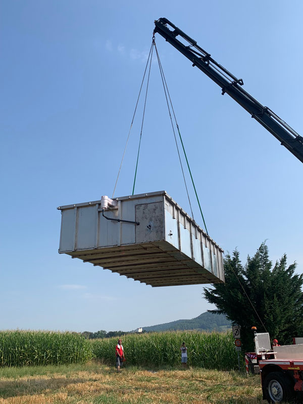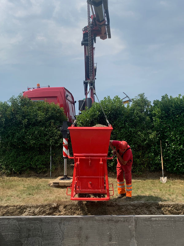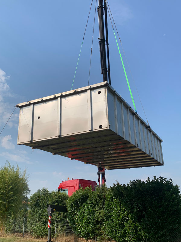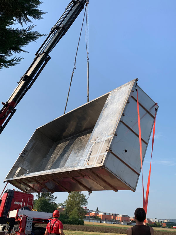 Die Lieferung erfolgt über einen Tieflader-LKW und einen Kranwagen und dauert mit dem gesamten einkiesen ca. 5 Stunden.